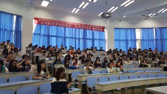 5月25日下午,第25届中国金鸡百花电影节微电影映单元暨第五届国际大学生微电影盛典推介会——“从克莱蒙费朗到成都”欧洲短片巡展专题讲座在思学楼B110举行。本次活动由科研处和艺术学院联合主办,主讲人是中国传媒大学博士、中国高等院校影视学会微电影专业委员会秘书长、中国高等院校影视学会微电影创研中心主任、第25届金鸡百花电影节微电影展映单元暨2016国际大学生微电影盛典组委会秘书长张炜副教授,另有影片播放和讲解人苏静、彭博两位老师出席活动。艺术学院副院长焦道利主持本次活动,同有我院广播电视编导专业教研室主任江霄老师以及编导教研室张新贤、岳堂、李晨老师与我院广播电视编导专业的同学们一起聆听了讲座。