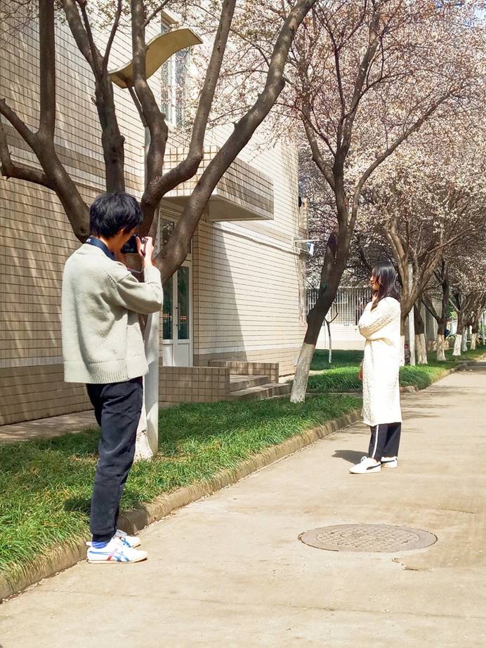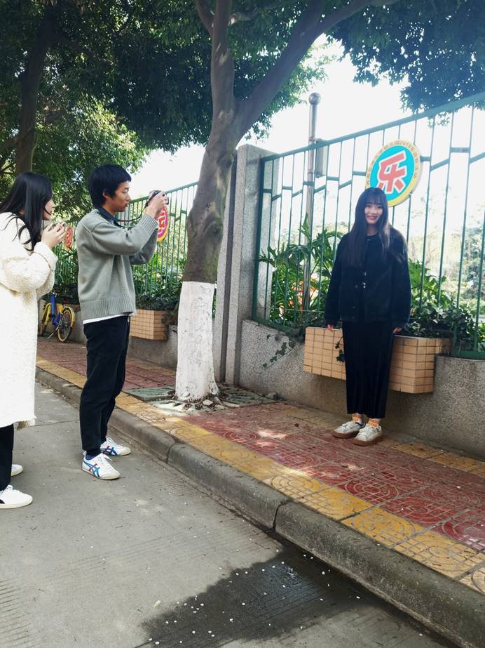 以校园红叶李为背景,初开花苞的红叶李,纯白的花体中带着一抹浅粉,正如女生般纯洁温柔、娇羞美好。黄雨茜同学一袭白衣站在红叶李树下,在白色花蔟相映衬下更显文静淑雅。陈晨同学照片的拍摄在附属幼稚园前取景,镜头下的她时而开怀大笑,时而嬉戏玩闹。整个拍摄过程都充满了欢乐的笑声。两人一动一静,都展现了女孩们最美好时光最美好的模样。