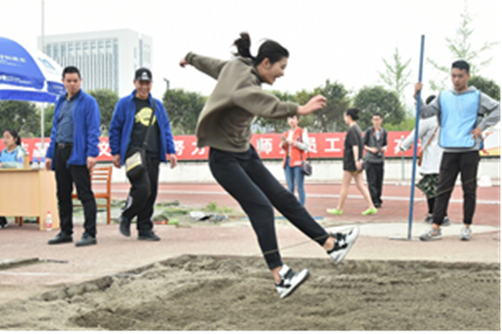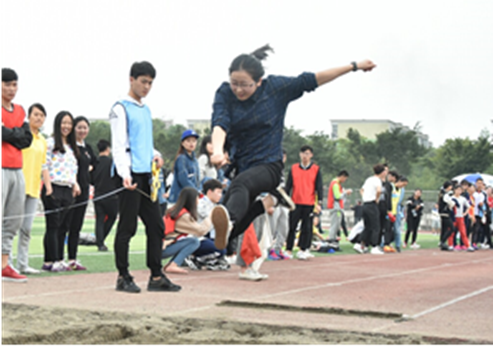 4月7日下午2点半,艺术学院冯春霞,彭莉娜,姜瑭琬等同学参加校运动会跳远比赛。