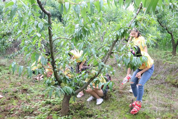这天西南石油大学艺术学院水果罗曼史实践队如往常一样来到了重庆市百胜镇,准备开始今天的果园劳作,今天阿姨要带我们去果园里的桃子林进行劳作。走过长长的一段田坎,我们终于来到了茂密的桃子林。