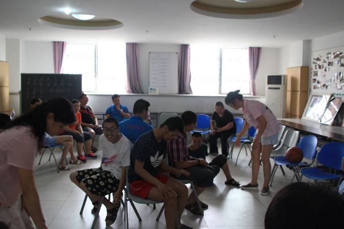 对他们来说我们并不陌生,几天的相处下来一个微笑一个眼神大家之间都能很好的交流。又到了游戏时间,今天玩了一个抢凳子的游戏。在激动兴奋的音乐中,他们谨慎而又开心的围着凳子绕圈圈。还有同学因为激烈的抢凳子摔了下来,虽然屁股很疼,被淘汰了,但是他说他依然很开心,重要的是参与的乐趣。