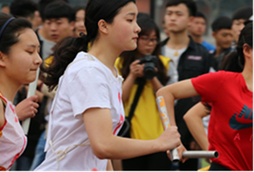 4月7日下午4点50分,艺术学院女生钟书梦、马文思、杨可可、周虹谷参加女子2000米异程接力比赛。