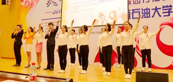 “没有什么比生命更为珍贵,除非人类放弃了这份珍贵。让我们心手相挽,用生命的光芒,驱散疾病与死亡的阴霾!”来自艺术学院的同学朗诵诗《飘扬的红丝带》,带动了现场的气氛,也让到场的嘉宾感受到了西南石油大学的同学们防治艾滋病的坚定决心。