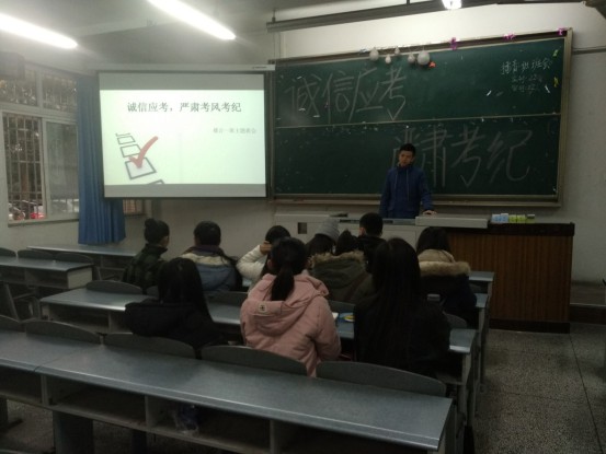 2015.12.17号,2015级播音一班在博学楼B201召开了关于“诚信应考,严肃考风考纪"的主题班会,此次班会意在强调考试纪律在大学生行为规范中的重要性,希望通过这次班会使各个同学认识到严守考试纪律的必要性以及违反考试纪律所带来的严重后果,以约束大学生自己的行为,做到诚信考试。