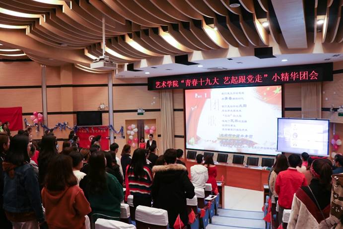十九大刚刚过去不久,认真学习党的十九大精神,是我们首要的政治任务。为使十九大精神深入到同学们的学习生活中,艺术学院于2017年11月16日晚在思学楼A114召开“青春十九大艺起跟党走”小精华团会。莅临本次团会的有校团委蒲彦羽老师、艺术院团总支书记何姗老师以及外院的评审团们,同时2017级全体同学参与了此次团会。