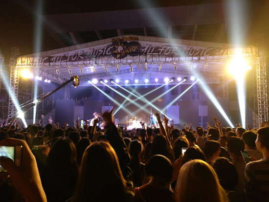 音乐会伊始,我校的四组原创音乐人:预言乐队,新朝阳乐队,王欣宇,鲁娅珺的原创歌曲点燃了现场的气氛,他们对音乐的执着发光发热,感染着在场的每个人。同时特邀嘉宾童党乐队和文轩音乐的返场嘉宾带来的歌曲,爆发力十足的旋律也让听众感受到了音乐所带来的狂热。音乐会现场为使观众欣赏的更为精彩,艺术学院的工作人员贴心地为同学们准备了徽章、贴纸以及雨衣,不让突然到来雨水冷却同学们的热情。