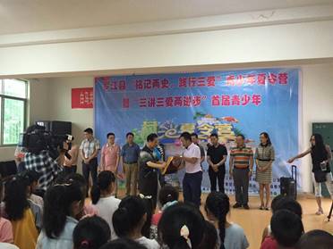 由于天气原因,原本户外的活动改成在会议室里进行。活动开始前,三名实践队员有序地带领几个孩子打扫会议室卫生。活动中,实践队作为夏令营礼仪代表,协助相关领导颁奖授牌给学校;另外又作为夏令营孩子代表负责举活动旗。活动最后,杨洁同学代表实践队接受了罗江地方电视台的相关采访。