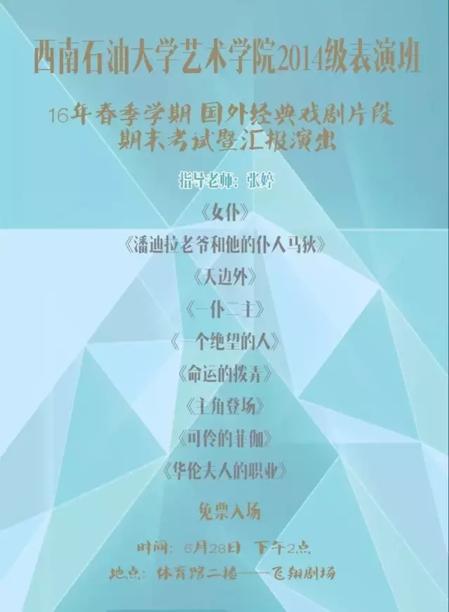 6月28日(周二)下午两点,西南石油大学艺术学院2014级表演专业将在飞翔剧场(体育馆二楼)进行大二下半学期国外经典戏剧片段期末考试暨汇报演出。本次演出包含《女仆》、《潘迪拉老爷和他的仆人马荻》、《天边外》、《一仆二主》、《一个绝望的人》、《命运的拨弄》、《主角登场》、《可怜的菲伽》、《华伦夫人的职业》在内的九部经典剧目片段。