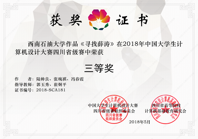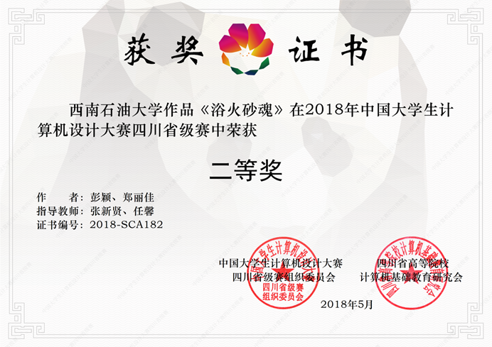 2018年“华迪杯·中国大学生计算机设计大赛四川省级赛”于2018年5月12日下午在成都武警警官学院落下帷幕,我院学生郑丽佳、彭颖、陆帅良、张婉祺、冯春霞带着他们的两部纪录片作品《浴火砂魂》、《寻找薛涛》分别在同类别参赛的作品中脱颖而出,取得四川省级赛二等奖和四川省级赛三等奖。