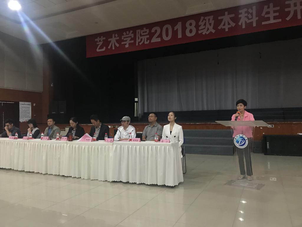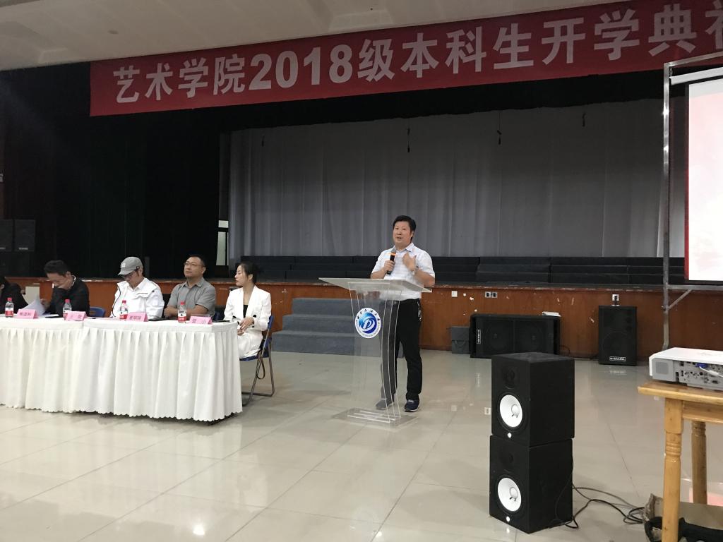 典礼开始,全场起立奏唱国歌。面对朝气蓬勃的新生,艺术学院党总支副书记何姗老师作为本次开学典礼的主持人,对成功走过高考独木桥进入心仪学府的各位新同学表示祝贺并向大家介绍到场的院领导和授课教师代表。随后,艺术院院长焦道利上台讲话,希望大家不负韶华,作为一名大学生,是中国的新生力量,也是未来祖国发展的主要动力,抓住宝贵难得的学习环境与资源是接下来四年的生活中最主要的任务,希望新生们能够使自己的才能得到展示,抓紧时间充实自我并担起创造未来的重任。教师代表李民在发言中强调了书籍对构成完善知识体系的重要性,一切的艺术创造都需要文化的沃土,这是我们不能忽视的根基。学生代表,团总支学生会主席涂正宁同学发表讲话,作为大三“老”学长分享了自己这三年来的成长与蜕变,将其总结为态度与情怀,他认为心灵的强大是我们奋斗最坚稳的后盾。最后,新生代表张晨曦上台发言,表达了对初入大学懵懂无知的他们处处帮助的各位老师以及学长学姐们的衷心感谢以及对未来大学生活的无限憧憬。