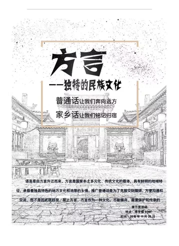 在前期,我们的小组成员们仔细研究讨论,先是制作了宣传单不断的修改、策划、研究,有专门为即将参与的同学们精心的准备小礼物,不断的想了许多可以将我们方言文化这一主旨串连在一起的小游戏,为了现场布置的更加温馨成员们提前去预定了教室等在活动开始时我们的主持人现为大家详细的介绍了方言的文化内涵,并且为大家现场播放了 准备前期拍摄了来自不同地域人所讲的不同方言,浓浓的方言文化是否也勾起了大家对于自己家乡的怀念了呢?