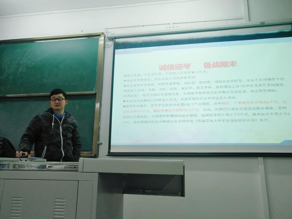 在2015级考风考纪专题班会上,孙晓光老师首先强调了全国硕士研究生统一招生考试和大学英语四六级考试的重要性和严肃性,提高同学们的重视度。详细为同学们讲解了考试中可能遇到的问题,以及学校对考试作弊行为的认定和处理办法,并重点宣读了学生手册中关于考试违纪处分的细则。他还就《刑法修正案(九)》关于考试作弊入刑定罪的具体内容和学校考试相关要求进行了讲解。希望广大同学能合理安排休息时间与学习时间,发扬为祖国加油、为民族争气的石大精神,进行认真充分的复习。在考场上,一定要将“诚实守信”作为第一要义,严肃考风考纪。并预祝同学们在接下来的考研和四六级考试中取得好成绩。