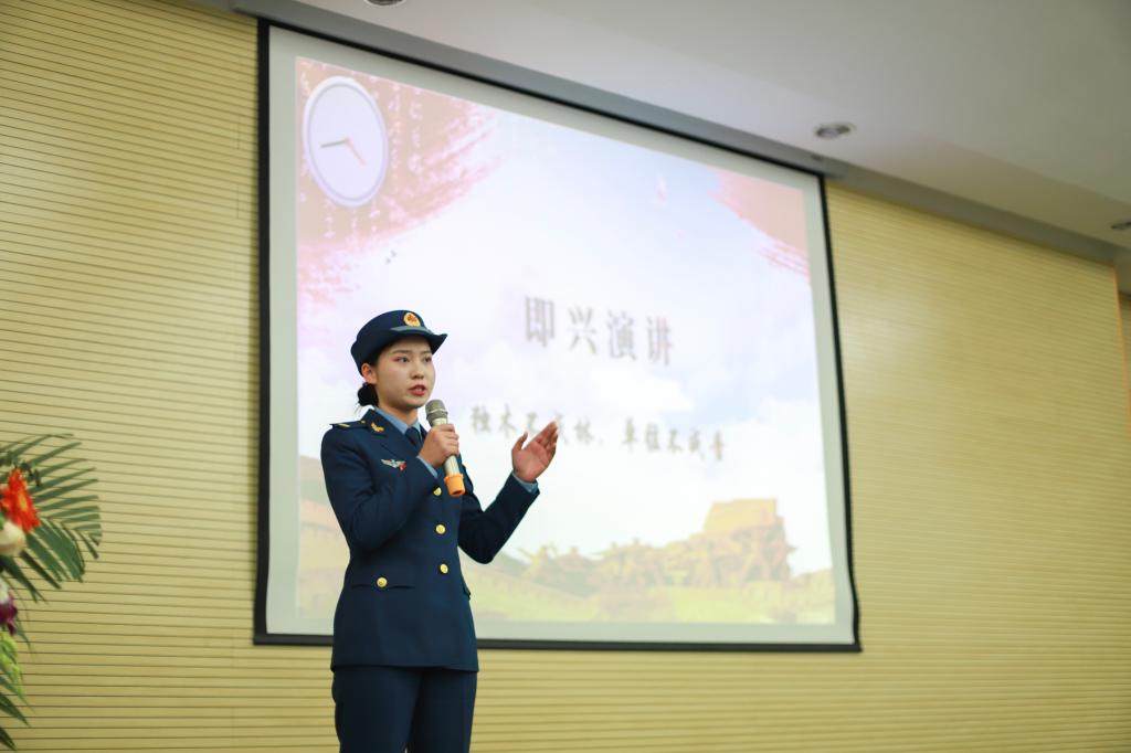 我院参赛选手杨润梅曾经是“中国人民解放军空军”的一员,是一名跳伞特种兵,两年前在祖国的感召下,毅然决定保留学籍参军入伍,今年服役期满回到学校完成学业。在演讲当中,杨润梅以自己的亲身经历,号召当代青年在新的历史时期要勇于肩负起民族复兴的伟大使命,要以敢于牺牲、奉献的精神为祖国做出自己的贡献,实现自己的价值,在演讲的过程当中,观众席多次响起热烈的掌声。