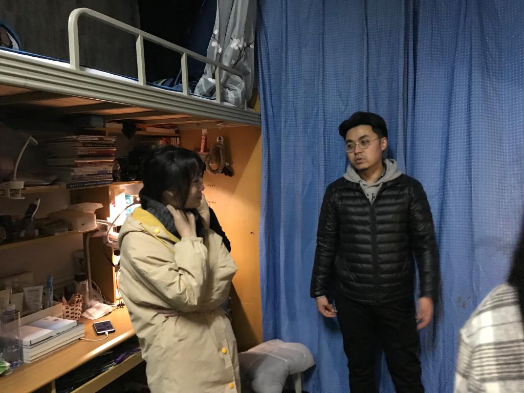 3月3日晚20:00,为确保寝室卫生安全、了解同学假期的生活,并对寝室人员是否归宿情况进行监督,艺术学院2018级辅导员李云峰,深入寝室与同学进行交流。
