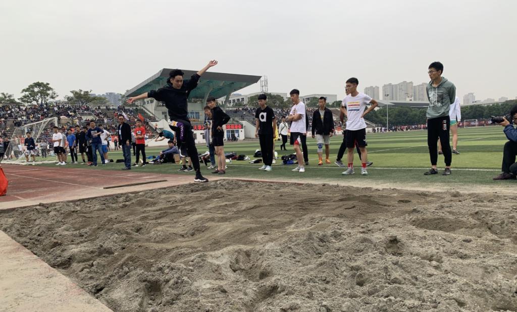 10月19日上午9时。校运动会男子跳远在一期操场拉开了帷幕。艺术学院商文瑞同学参加比赛。
