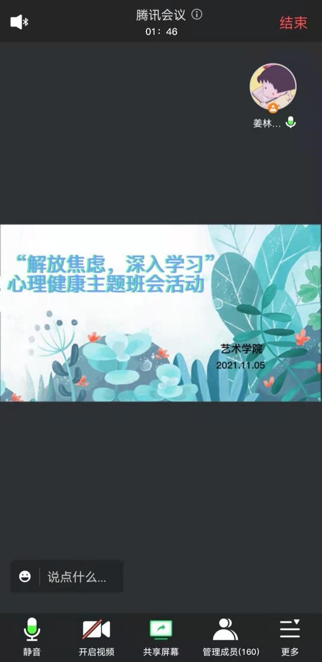 现如今许多同学都会产生学习焦虑、职业焦虑,社交问题也接踵而至,关注大学生心理健康问题尤为重要。为帮助同学缓解学习压力,交流学习经验,更积极的面对大学生活中遇到的问题,11月5号,艺术学院开展了线上班级心理健康主题班会活动。