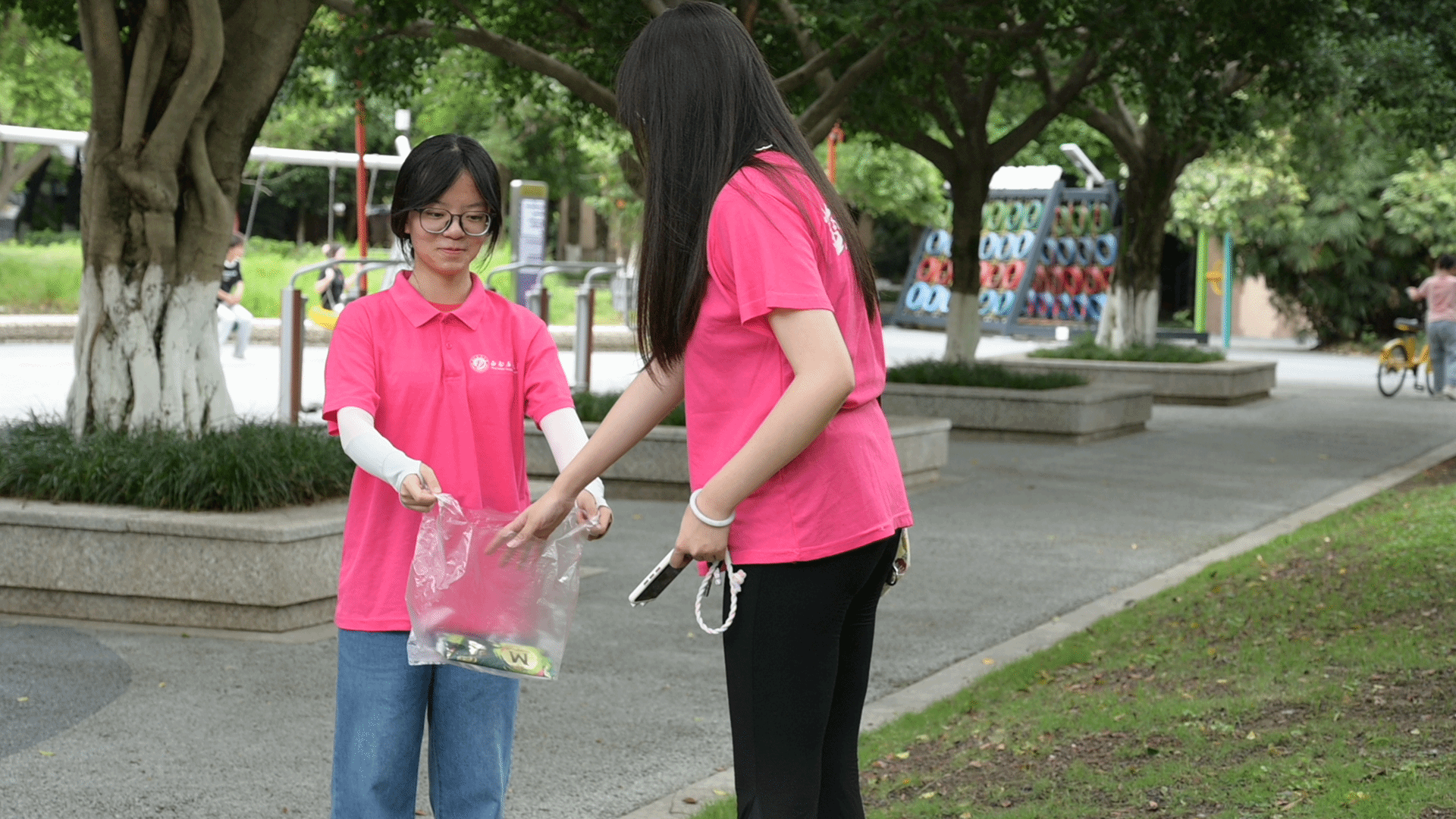 擦拭公共器材,守护居民健康。为保障居民使用安全,同学们也对辖区内的健身器材、休闲座椅等公共设施进行全面清洁维护。同学们使用专业消毒液和抹布,对每一处健身器材进行仔细擦拭和消毒,重点清洁了高频接触部位。有经常锻炼的居民表示:“这些器材我们天天用,孩子们也爱玩这些娱乐设施,平时老怕有细菌,现在消毒了也更放心了。”