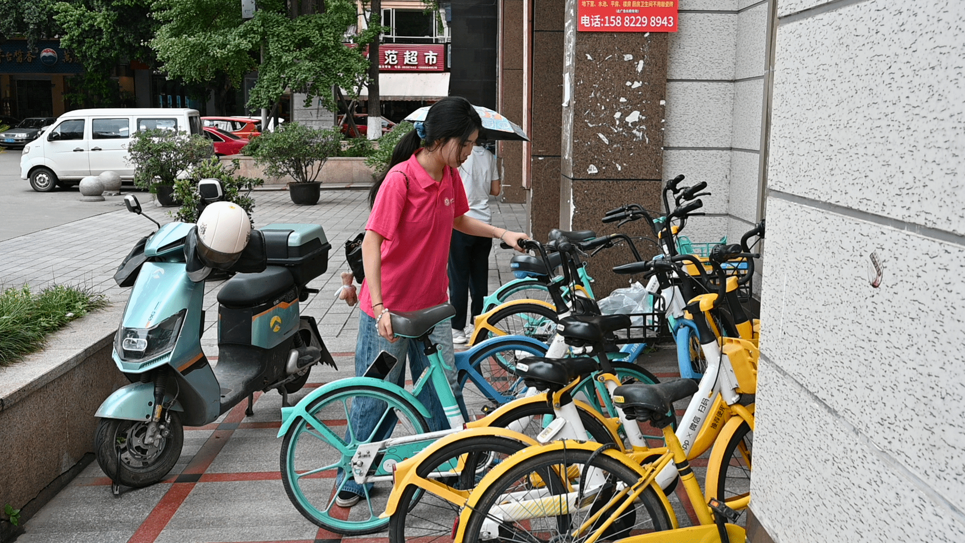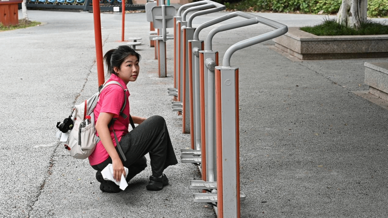 成员在进行共享单车的规范停放