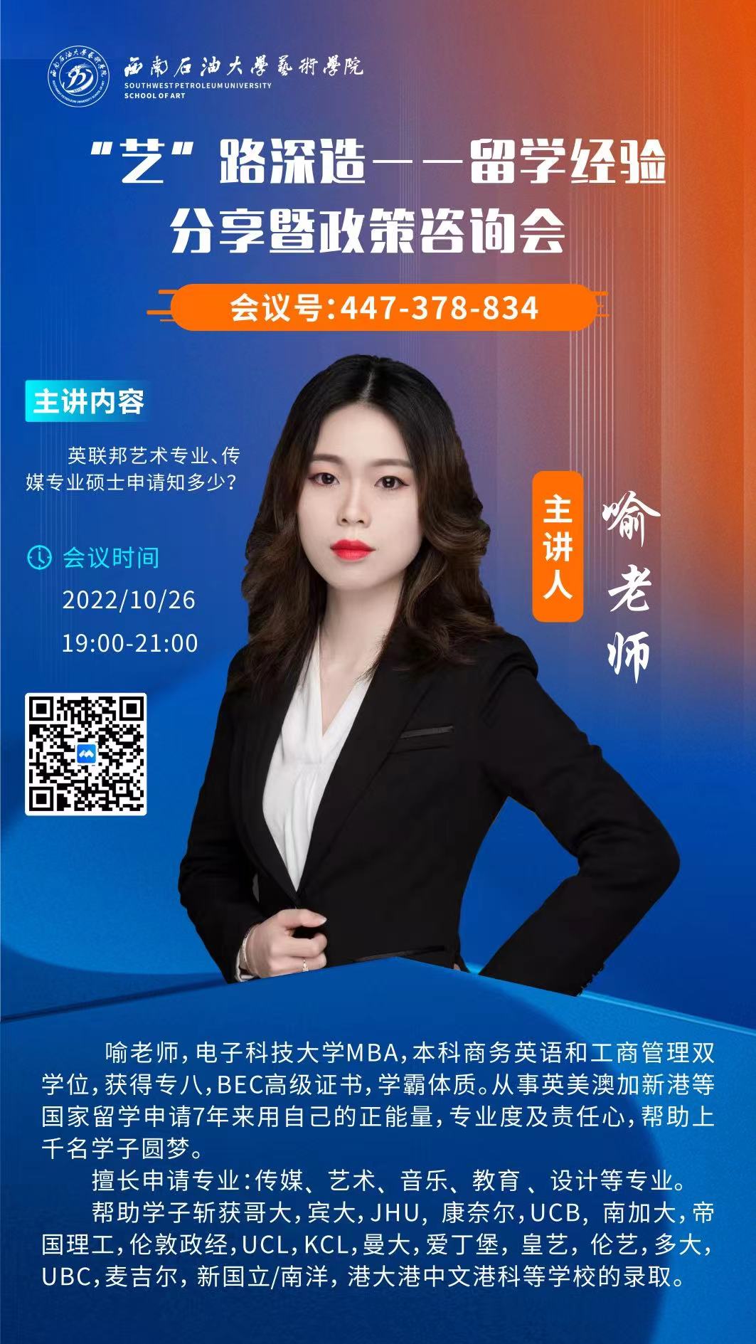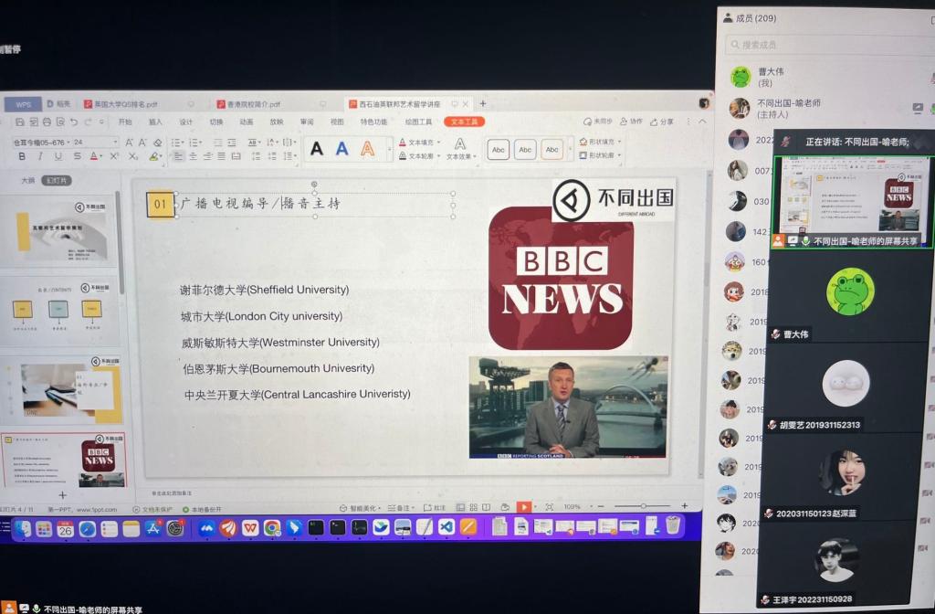 为给学生提供更多就业选择,拓宽国际视野,普及留学相关知识,艺术学院10月26日举办了线上留学宣讲会,成都不同出国留学主管喻老师、毕业班辅导员孙晓光以及我院200多名学生参加了本次宣讲会。