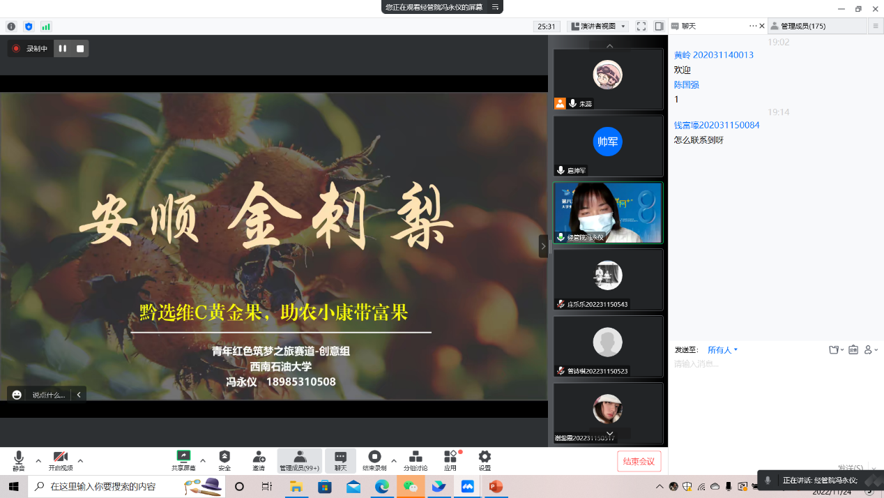 本次讲座大致分为了三部分。扈帅军学长首先向我们介绍并展示了他的国防教育项目,深刻阐释了国防教育的重要性,和四川大学、电子科技大学等众多川内高校合作,获得了四川省省委宣传教育处王军处长的指导,并取得丰硕的成果。冯永仪学姐向我们展示了她经历多轮筛选、多次打磨的扶农富农金刺梨项目,让参会的我院学生感慨颇深。