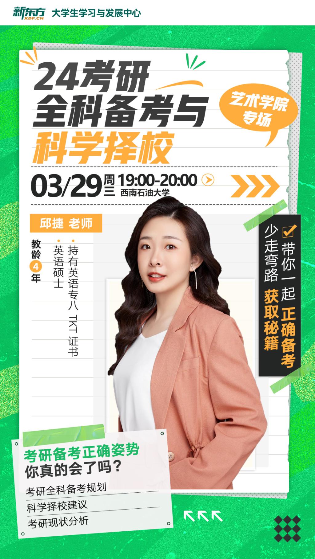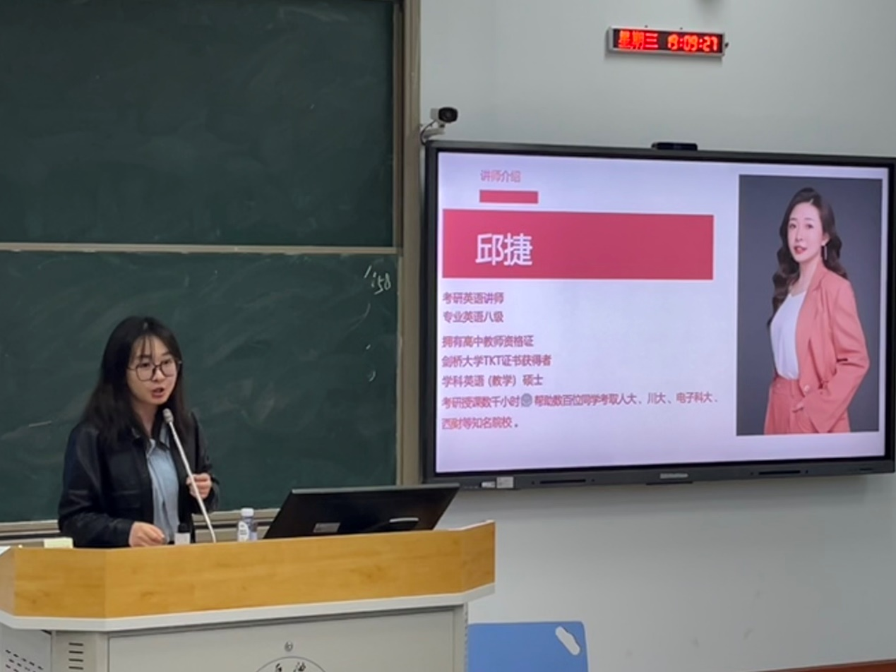 4月1日,来自成都新东方教育的邱捷老师来到西南石油大学艺术学院,为我院同学带来了一场名为“24考研全科备考与科学择校”的专题讲座。