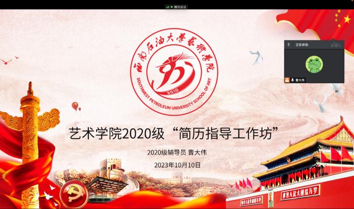 10月10日16:00,艺术学院通过腾讯会议召开2020级“简历指导工作坊”专题指导会,该活动旨在帮助同学们优化简历,提升就业竞争力,会议由辅导员曹大伟老师主持,2020级全体学生参会。