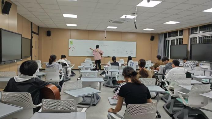 课程内容丰富有趣。首先,陈浩文向在场的同学介绍吉他的起源、发展和演变过程,分析各类吉他之间的不同之处,带领大家一同领略了吉他这一乐器的独特魅力。接着,谢靖禹详细讲解吉他使用及保养的知识。他强调,正确维护吉他对于延长其使用寿命十分重要。随后,陈浩文与谢靖禹共同教学吉他演奏的基础知识,包括正确的持琴姿势、手型调整、右手拨弦技巧等,帮助参与者初步掌握吉他的基本演奏方法。