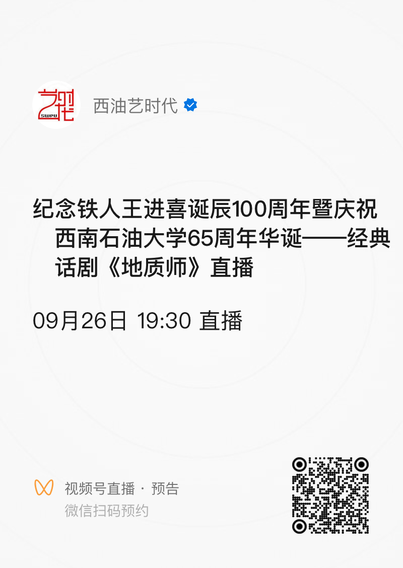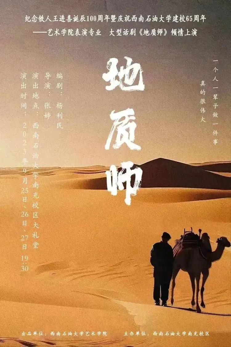 在铁人王进喜诞辰100周年、西南石油大学建校及川中石油大会战打响65周年之际,艺术学院表演专业师生精心排演大型话剧《地质师》,以美育的形式发扬我校“为祖国加油,为民族争气”的精神,向铁人致敬,向母校献礼。同时,该作品也向所有为祖国油气事业奋斗的工作者致敬。并为2023级新生们上好西南石油大学精神第一课。
