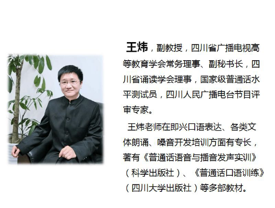 王炜老师有着十六年的高校教育教学经历和十年的普通话水平测试培训经历,在即兴口语表达、各类文体朗诵、嗓音开发培训方面有专长,具有丰富的普通话语音、播音发声和语言表达教学实践经验。两次荣获西南石油大学课堂教学质量奖,著有《普通话语音与播音发声实训》(科学出版社)、《普通话口语训练》(四川大学出版社)等多部教材。在这次微课中,王老师主要从培训师嗓音保护、嗓音塑造、发声位置等方面作了简单的介绍。咽炎是长期困扰老师的职业病,这也是各位老师向王炜老师提出的最多的问题。在微课中,王老师着重讲解了如何掌握科学发声的方法,如何合理的保护嗓子,最后在微信群中指导各位老师进行了练习。老师们纷纷表示,期待这样实用的课程能够不定期开讲,使大家从中受益,不断进步。