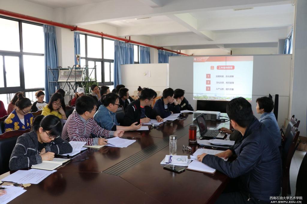 3月22日下午,学院在艺术大楼206会议室召开年度主要工作安排暨本科教学评估迎评动员会。会议由艺术学院党总支书记殷冲主持,院长焦道利、党总支副书记何姗及全院教职工参加会议。