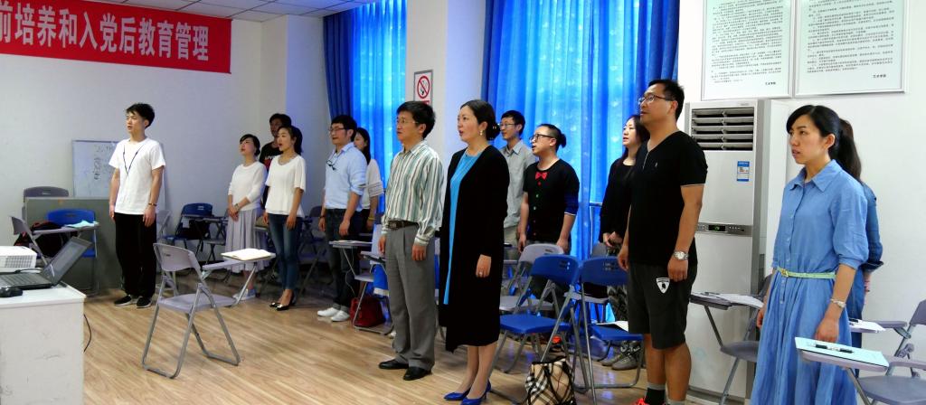 会上,全体教职工党员重温入党誓词。全体教职工党员同志合唱《国际歌》与《义勇军进行曲》,并由崔炯屏同志带领大家在党旗下庄严宣誓。