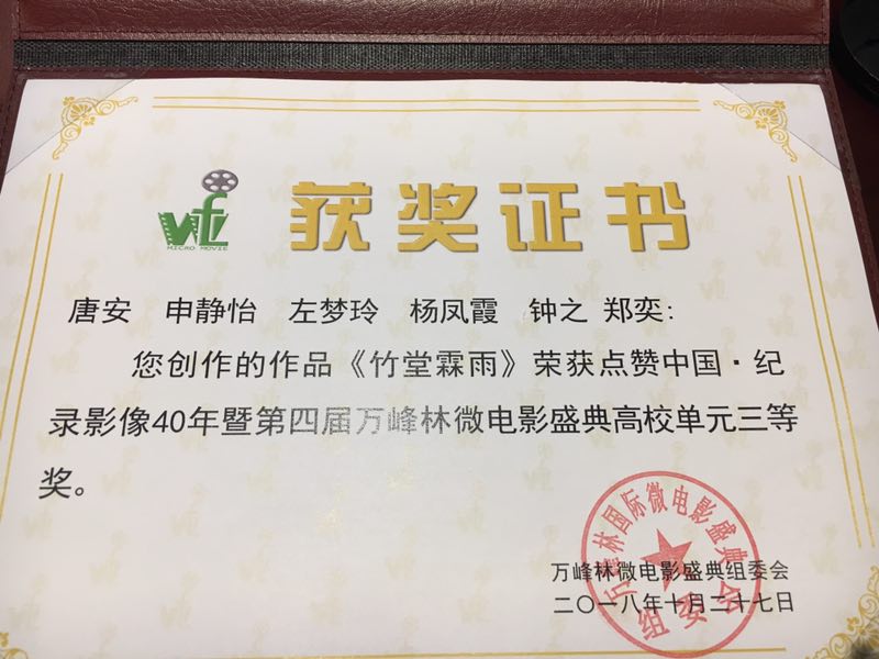 本次影像盛典由中国文化信息协会国际影视文化交流专业委员会、中国社会科学院新闻所世界传媒研究中心、中国高等院校影视学会主办。作品征集活动从今年5月开始,共有4200余部作品报名参赛,最终,156部作品分获各类奖项。我院学生左梦玲、唐安、申静怡、钟之、杨凤霞、郑奕制作完成的作品《竹堂霖雨》获得此次大赛的三等奖。