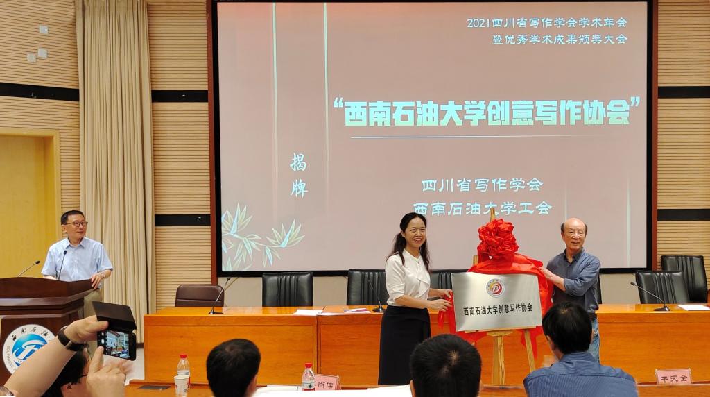 学校工会副主席殷冲与四川省写作学会干天全会长共同为“西南石油大学创意写作协会”揭牌