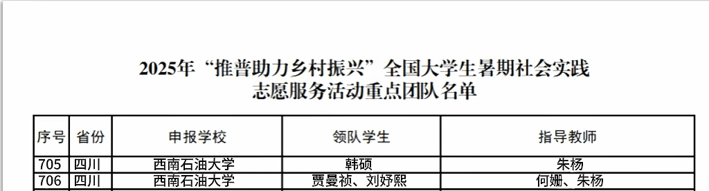 近日,教育部语言文字应用管理司、共青团中央青年发展部公布了 2025 年 “推普助力乡村振兴” 全国大学生暑期社会实践志愿服务活动入选团队名单。在此次活动中,全国各高校师生积极参与、踊跃报名,共有 1680 所高校的 8013 支团队、8 万余名师生参与申报。经相关国家语言文字推广基地组织专家严格审议,最终仅推荐 1000 支团队入选重点团队。由我院党委副书记、纪委书记何姗,辅导员朱杨指导的“普通用语,绘同心圆”——推普助力乡村振兴社会实践志愿服务队以及马边梦曦支教队成功跻身全国 1000 支重点团队行列。