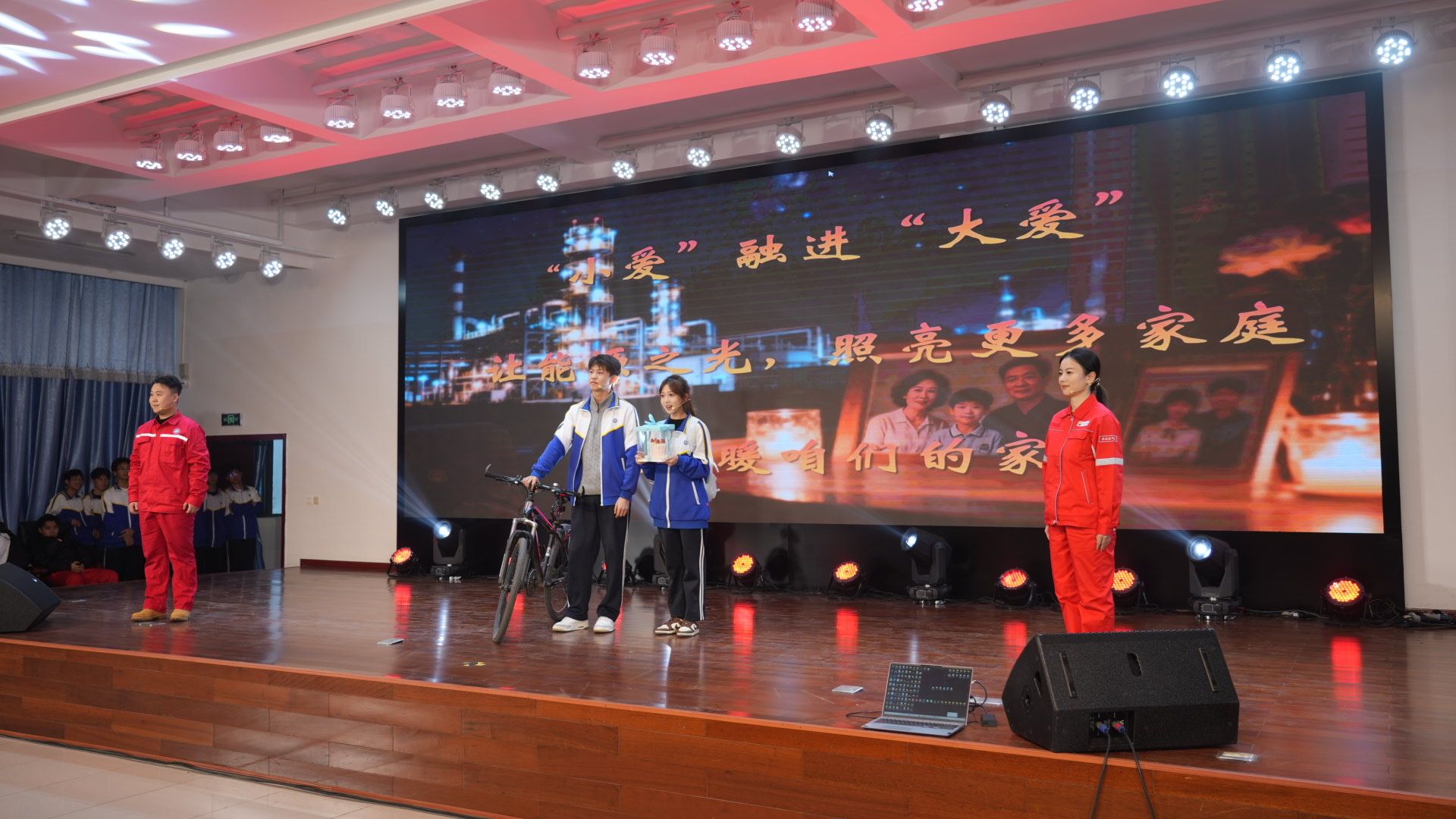 情景朗诵《家国“油”我》散发着原油的芬芳,把这堂课推向高潮。节目通过一个石油家庭的故事,折射出无数将“小我”融入能源报国“大我”的选择。接着,一部由AIGC制作的科普短片《远古的馈赠》,以震撼的影像揭示了能源的奥秘。在孩子们惊叹的目光中,我校党委副书记、工会主席丁林,党委常委、统战部部长蒲勇将科普读物《油气简史》赠予学生代表。“希望这本书,能为你们打开一扇看向更远世界的窗。”丁林说道。