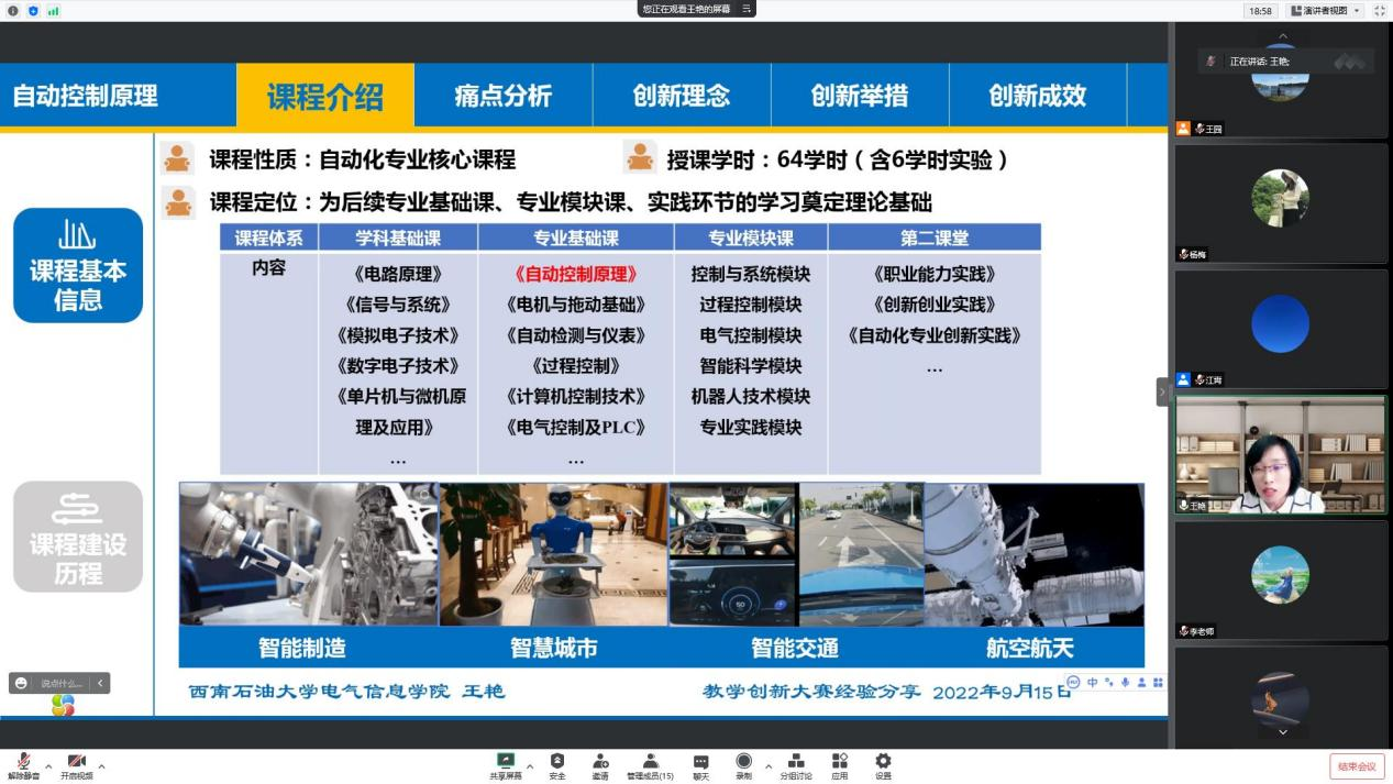 活动伊始,王艳老师分享了全国高校教师教学创新大赛一等奖课程《自动控制原理》的设计思路,并从课程介绍、痛点分析、创新理念、创新举措和创新成效这五个模块阐述了本门课程的教学创新。王艳老师说到:“虽然本门课是一门理论课,通过与大量的实际案例结合和以“一中心、四导向能力“逐层,递进的教学模式,让理论课变得有趣起来。”
