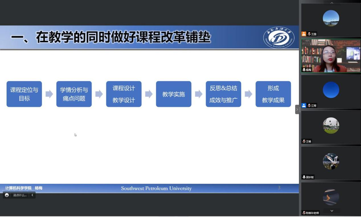 之后杨梅老师分享了她参加全国高校教师教学创新大赛的所见所闻,同时从课程定位与目标、学情分析与痛点问题、课程设计与教学设计、教学实施、反思和总结成效与推广、形成教学成果等五个步骤来阐述参赛课程的创新逻辑。杨梅老师说到:“即使是公共基础课也同要需要老师们集思广益,发展出更多可能。”