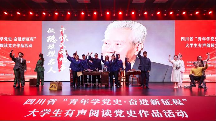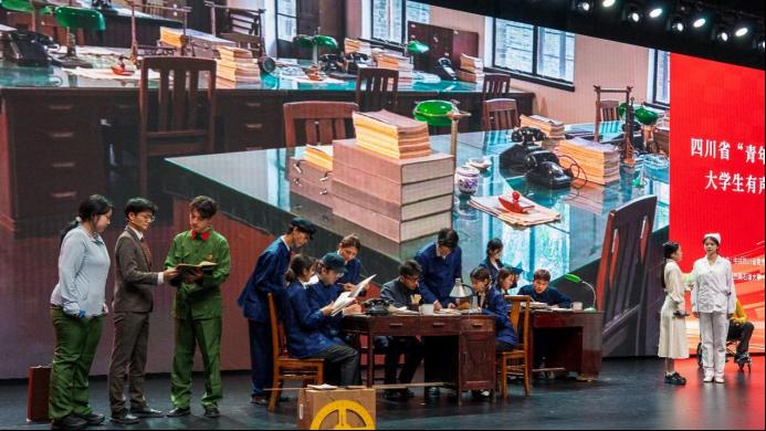 此外还有来自四川农业大学、四川音乐学院等高校的10个获奖作品参与了现场展演。同学们深情展示了中国共产党带领四川人民进行革命、建设、改革的生动故事,热情讴歌英雄人物可歌可泣的光辉事迹。川康大地获解放、三线建设、“我党我军政治工作第一人”刘伯坚、中国人民志愿军特级战斗英雄黄继光、中国核潜艇之父彭士禄……一个个鲜活的事例和人物在同学们的讲述下,仿佛让大家穿越时空,回到了那段波澜壮阔的光辉岁月,身临其境感受党治蜀兴川砥砺前行的伟大历程。