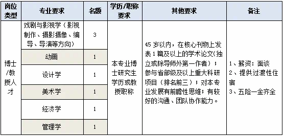影视制作学院 | 摄影摄像技术教师 | 摄影、电影、影视制作、导演相关专业 | 1 | 摄影摄像方向。 影视剧作或影视技术方向,熟练使用影视摄影灯光器材,参与过相关影视作品制作,有摄影摄像比赛经历更佳。具有纵向或横向科研能力。 |