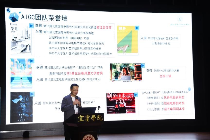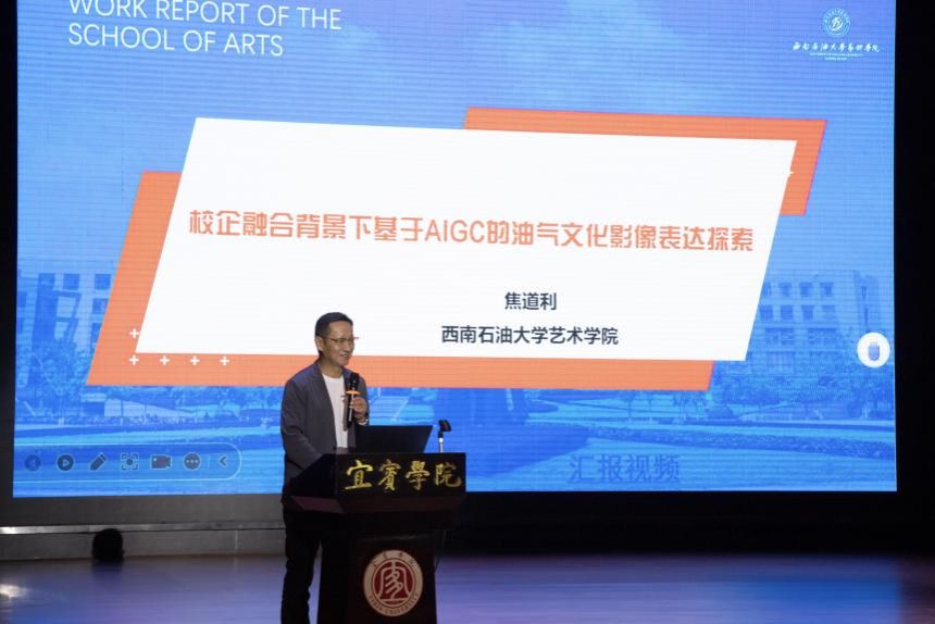 主会场上,焦道利院长以《校企融合背景下基于AIGC的油气文化影像表达探索》为题作了精彩发言。焦道利院长介绍了我院近来在智能影像创作方面的创新成果,并重点展示了两部AIGC作品——《远古的馈赠》和《传承》。两部作品通过智能影像艺术与能源文化的完美融合,彰显了艺术学院服务于学校能源特色的使命担当。发言最后,焦院长呼吁艺术教育工作者要“主动拥抱新技术,在变革中把握机遇”,这一前瞻性观点引发了与会者的强烈共鸣。