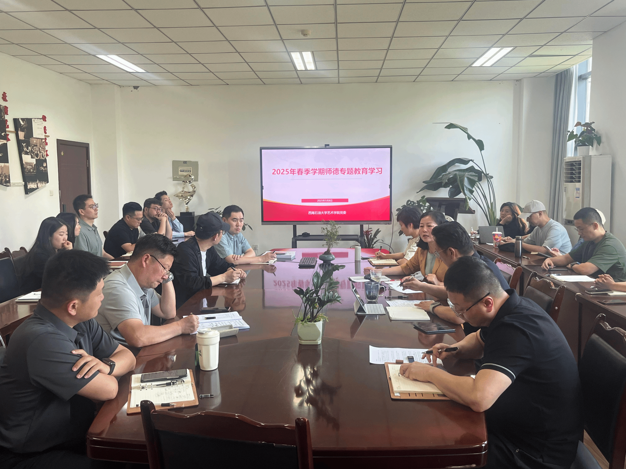 为深入贯彻落实党的二十大精神,持续加强师德师风建设,引导广大教师以德立身、以德立学、以德施教,4月24日下午,艺术学院组织召开2025年春季学期师德专题教育学习会议。会议由学院党委书记夏艳主持,全体教职工参与本次主题学习会。