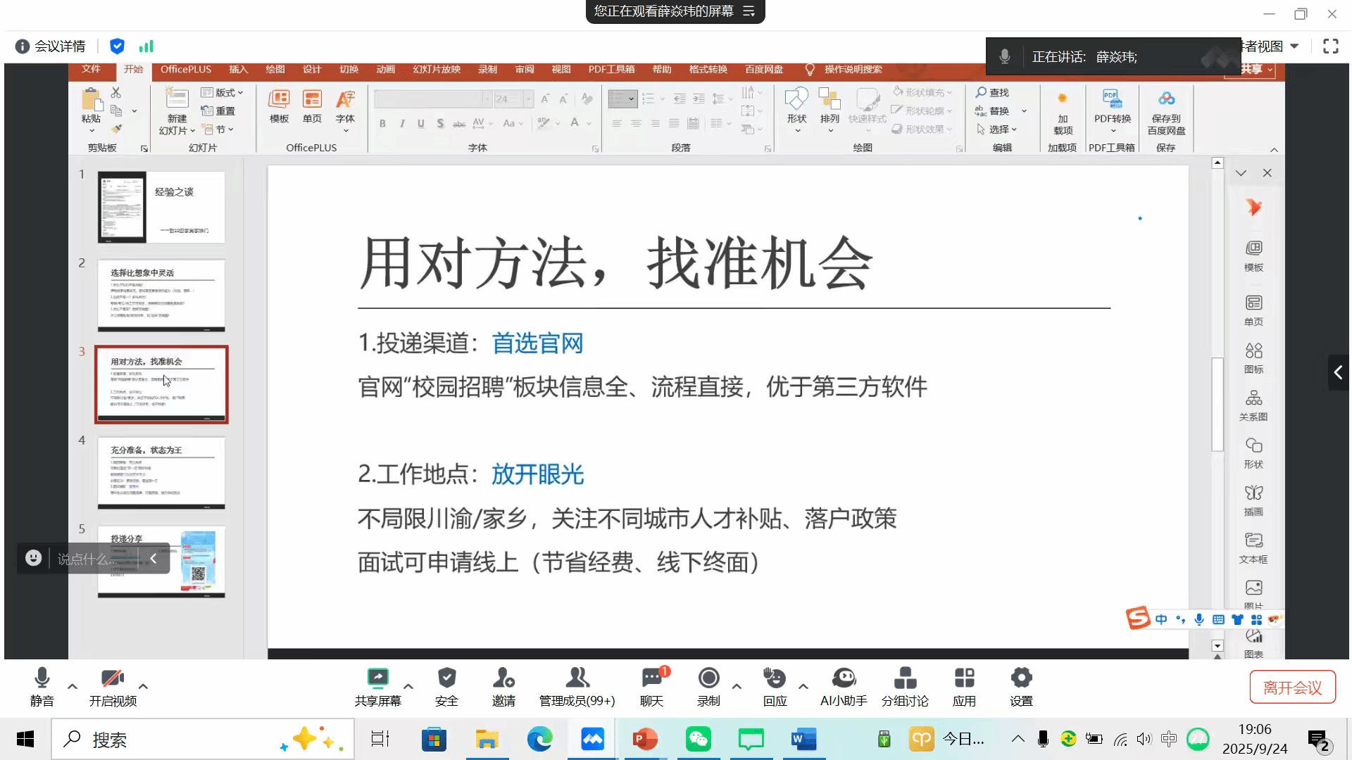 在实操层面,薛学姐倾囊相授。简历投递方面,她建议优先选择企业官方渠道以确保信息准确,并鼓励大家将目光投向人才政策优厚、产业资源集聚的一线及新一线城市,积极争取各类补贴福利。面试准备方面,她反复强调“充分准备是自信的源泉”,建议同学们深入挖掘个人经历与岗位的关联性,并演示了如何利用AI工具进行高频问题模拟和回答思路优化,从而在面试中脱颖而出。
