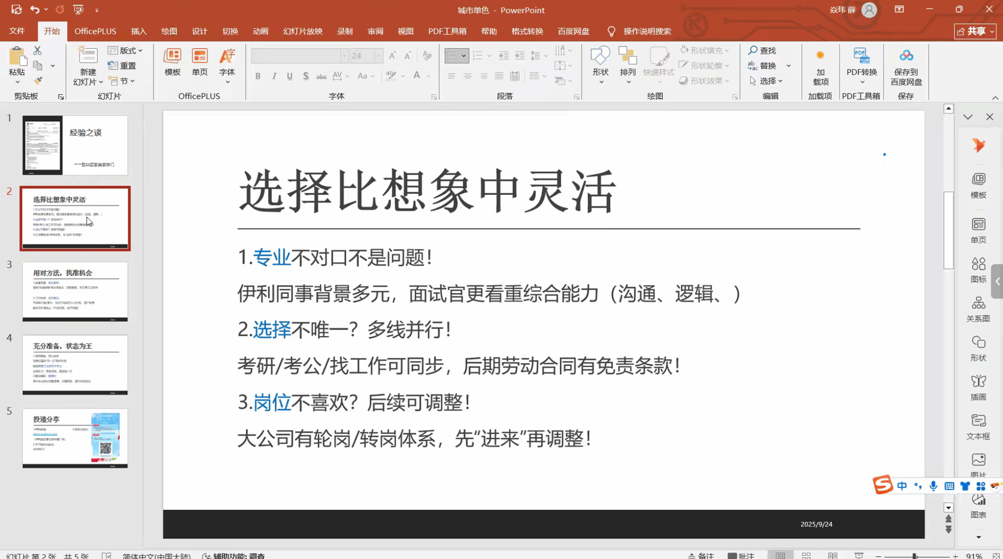 在职业路径选择上,她提出了“多线并行、动态调整”的务实建议,阐释了在求职黄金期内同步准备考研、考公或留学的可行性与策略,并解读了劳动合同中相关条款提供的灵活空间。她还分享了“进入平台、再谋发展”的思路,以自身为例说明了如何通过大企业的内部轮岗或转岗机制,探索多元的职业发展方向。