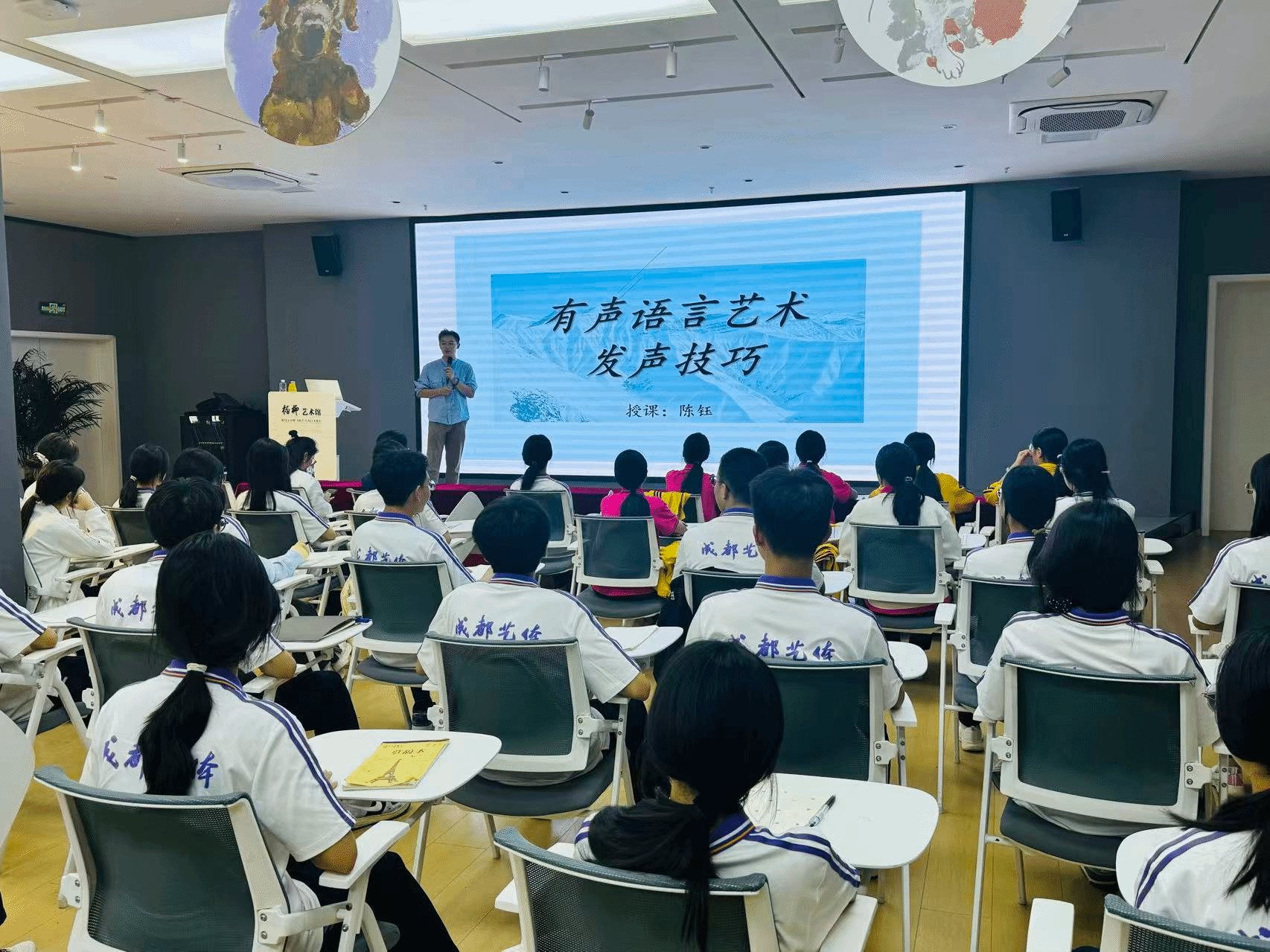 播音与主持艺术专业教研室教师陈钰则聚焦专业技能科普,在四川省双流艺体中学开展《有声语言艺术发声技巧》专题讲座。讲座中,陈钰从基础发声原理入手,结合生动的现场示范,逐一拆解气息控制、音色调整、情感表达等核心技巧,针对学生常见的发声误区进行一对一纠正,让原本抽象的专业知识变得直观易懂。同时,他还向同学们介绍了播音与主持艺术专业的课程体系、就业方向,以及西南石油大学艺术学院的专业培养特色与近年育人成果,为有艺术特长的学生清晰勾勒出专业发展路径,激发了大家对传媒艺术类专业的探索兴趣。