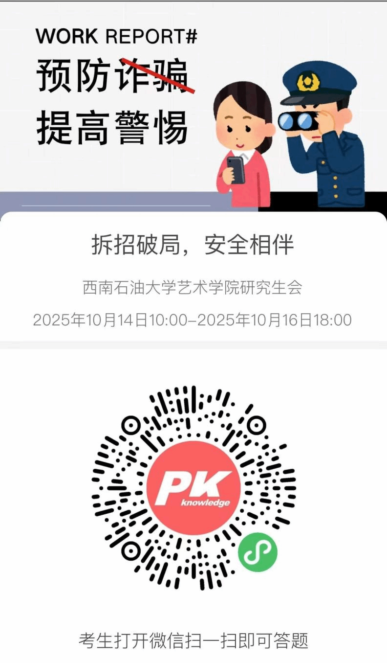 10月14日至10月16日,由艺术学院研究生会主办的“拆招破局,安全相伴”知识答题活动顺利开展。本次活动以创新形式聚焦校园安全,35名艺术学院研究生踊跃参与,在趣味答题中共同筑牢校园安全防线。