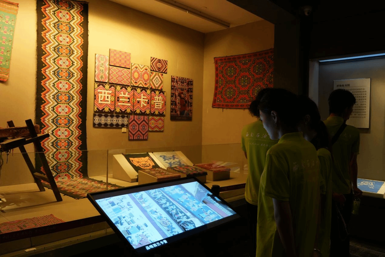 实践的第一站是恩施州博物馆。在这里我们看到了土家族妇女使用的传统木织机,见到了这种老式织布机的制作全过程,欣赏到了以棉线、丝线为原料编织出色彩绚丽、图案丰富的织锦。通过讲解员的详细讲解,大家了解国家级非物质文化遗产——西兰卡普(土家织锦)的历史与发展。在土家语里,“西兰”是“铺盖”的意思,“卡普”是“花”的意思,“西兰卡普”即土家族人的花铺盖。这些花铺盖色彩鲜明、热情奔放,双凤朝阳、四凤抬印、猫脚迹花等丰富造型栩栩如生,一针一线承载着土家姑娘们对生活的热爱。这些织锦不仅是实用的生活用品,更是承载着土家族文化记忆的艺术瑰宝。