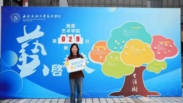 活动现场还特别设置了”心向未来•成长树”签名区,作为心理节的另一大亮点。新生们在生涯树上郑重写下自己的名字,成为“第____位新上人”,象征着他们正式加入艺术学院大家庭。展板以“生涯树”为主题设计,每一个签名如同树上新生的枝叶,寓意着大学生活即将展开的无限可能。