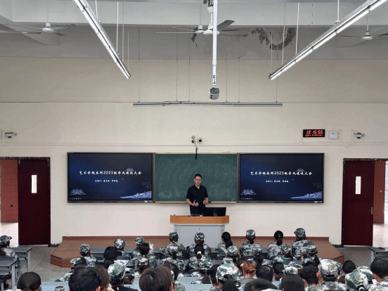 会议现场,2025级本科新生身着迷彩服整齐就座,认真聆听主讲老师的分享。曹大伟老师结合艺术专业学习特点,从“明确学习目标”“培养良好学习习惯”“恪守学术诚信”三个维度展开讲解。他强调,艺术学习需兼具扎实的专业功底与创新思维,同学们要在日常学习中主动探索、勤练技艺,以严谨的学风对待每一次创作与研究。