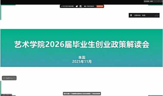 为帮助2026届本科毕业生明晰创业就业政策导向,把握发展机遇,11月21日,艺术学院开展线上创业政策解读与经验分享会议。2026届应届毕业生辅导员朱蕊担任主讲人,围绕国家及地方创业扶持政策、经典创业案例等核心内容展开详细解读,为即将踏入职场或投身创业的毕业生送上“实战锦囊”。