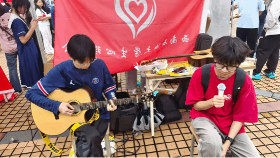 为搭建兴趣交流平台、吸纳新鲜力量,艺术学院各社团提前开展筹备工作。吉他协会成员现场演奏经典曲目,悠扬旋律萦绕广场,成为招新现场的一道独特风景线;聚光配音社、西伶曲艺社、青鸟话剧社则通过展板展示、资料分发等形式,详细介绍社团宗旨、往年活动亮点及日常运营模式,让新生全面了解社团特色。